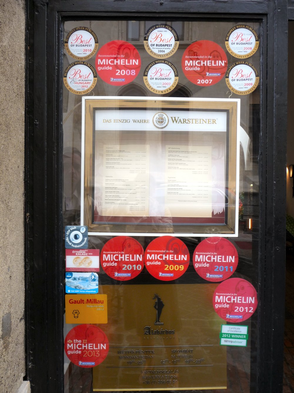 Das Restaurant Alabárdos gibt es seit 1964 auf dem Burgberg: Anfang 2014 wurde die Innenausstattung komplett renoviert. Schon einige illustre Gäste besuchten das Etablissement laut Webseite des Restaurants, darunter der ehemalige französische Staatspräsident Valéry Giscard d’Estaing, der amtierende ungarische Präsident Viktor Orbán, Sir Roger Moore alias James Bond, Martin Winterkorn und Wolfgang Porsche. Sogar der berühmte Sternekoch Eckart Witzigmann lies sich nur wenige Tage nach unserem Besuch dort gerne zusammen mit dem Küchenchef Attila Bicsár am 9. Oktober 2014 ablichten.